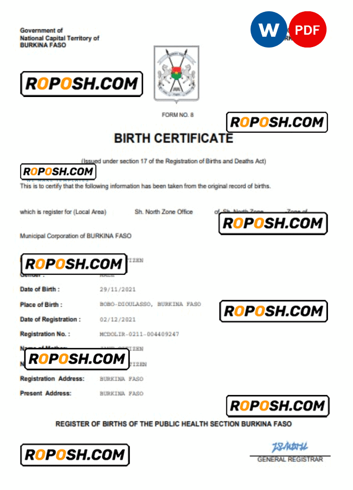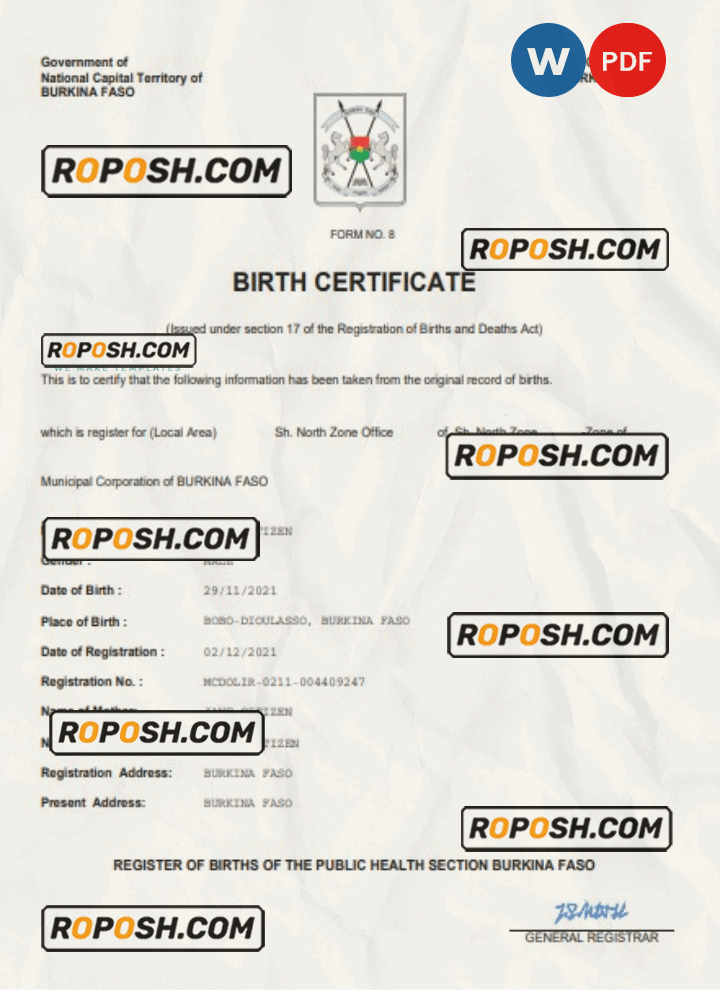 roposh offers hundreds of high-quality, realistic, and customizable birth certificates. The Burkina Faso birth certificate template is fully fillable, and you can complete it with any information you wish, such as name, surname, birth date, place of birth and etc. Whether you are using our PSD template (a layer-based adobe photoshop file) or our PDF template (a Microsoft Office editable file) you will get a package with fonts included instantly. No need to worry even if you can’t generate realistic birth proof yourself, we offer reliable editing service with your desired information for an extra charge. Also, we are always online and here to help you experience a confident purchase. So, reach out!