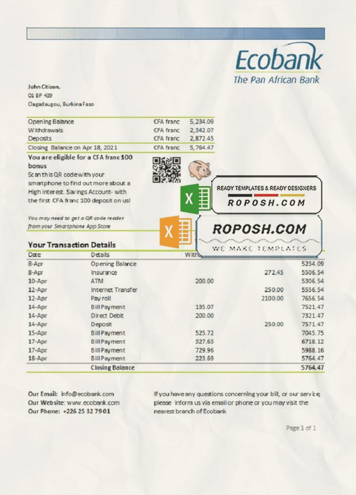• Burkina Faso Ecobank Bank Statement Template in Excel and PDF