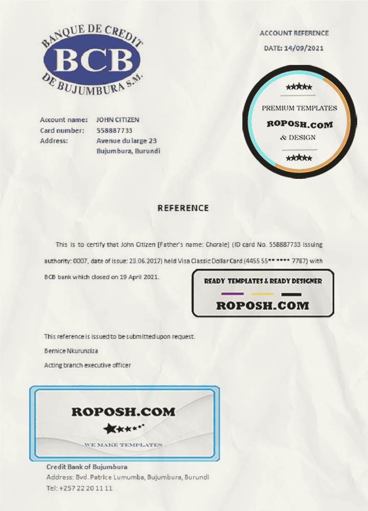Burundi Credit Bank of Bujumbura bank account closure reference letter template in Word and PDF format