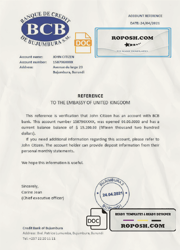 Burundi Credit Bank of Bujumbura bank account reference letter template in Word and PDF format