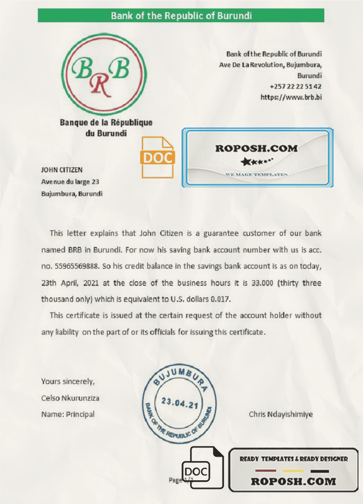 Burundi The Republic Bank of Burundi bank account reference letter template in Word and PDF format