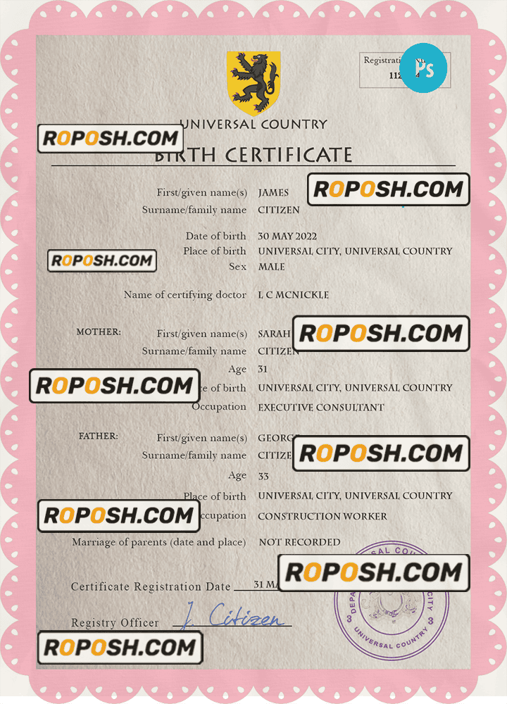 roposh offers hundreds of high-quality, realistic, and customizable birth certificates. The busk universal birth certificate template is fully fillable, and you can complete it with any information you wish, such as name, surname, birth date, place of birth and etc. Whether you are using our PSD template (a layer-based adobe photoshop file) or our PDF template (a Microsoft Office editable file) you will get a package with fonts included instantly. No need to worry even if you can’t generate realistic birth proof yourself, we offer reliable editing service with your desired information for an extra charge. Also, we are always online and here to help you experience a confident purchase. So, reach out!