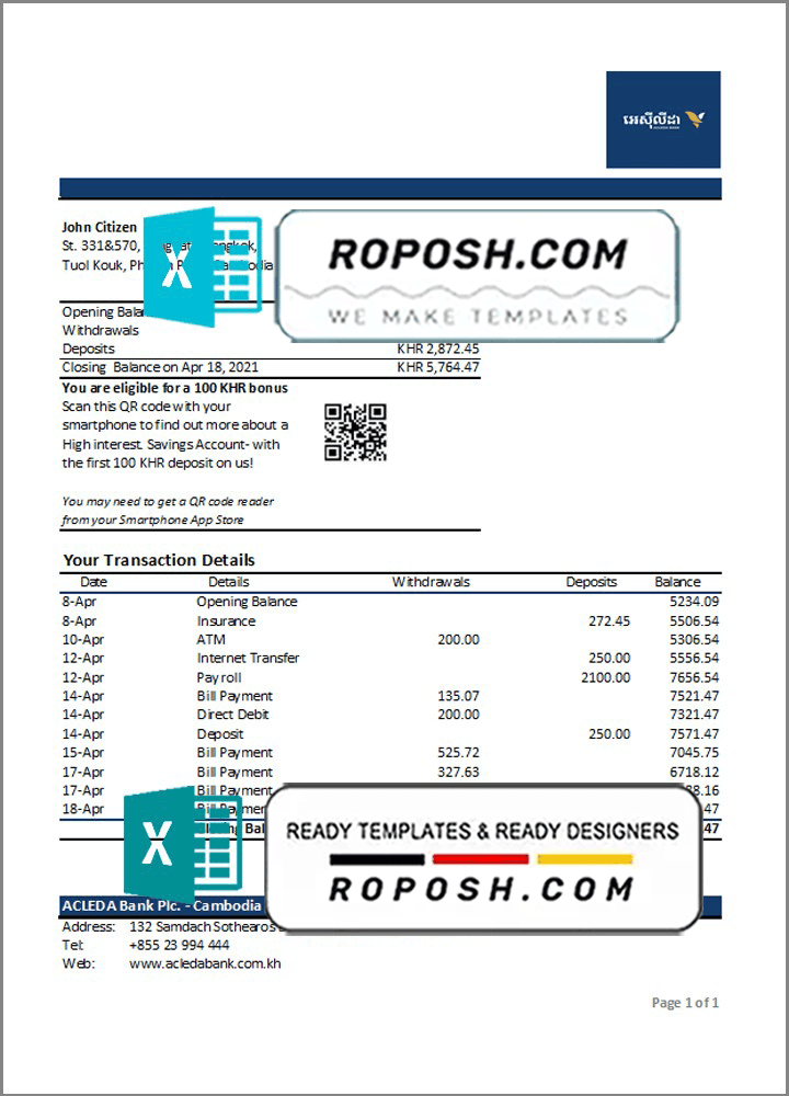 Cambodia ACLEDA Bank Statement Template in Excel and PDF Format