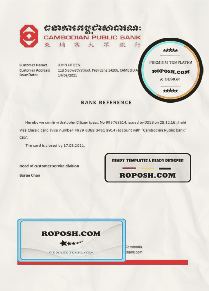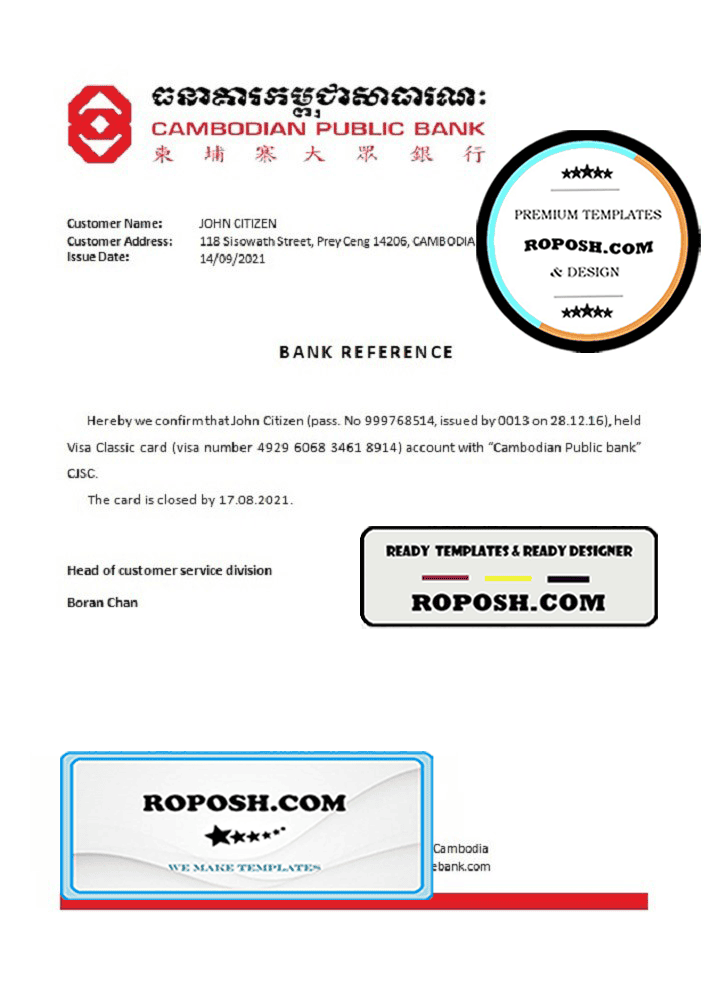 Cambodia Cambodian Public Bank account closure reference letter template in Word and PDF format offer high-quality customizable bank reference form template in PSD and Word format, allowing you to easily fill in your personal details and make them look authentic. Our templates are perfect for online account verification, research, presentation, or work.