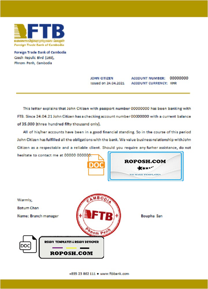 Cambodia Foreign Trade Bank of Cambodia bank account reference letter template in Word and PDF format