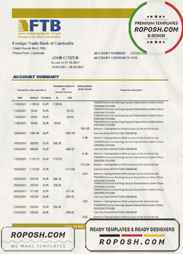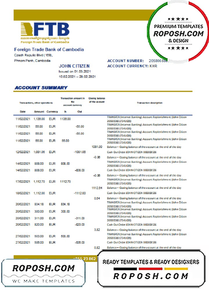 Get your fully editable Cambodia Foreign Trade Bank Statement Template from Roposh today. Customize it with your own information to create a realistic bank statement. This is especially useful if your original statement is expired, stolen, or unavailable. We also offer a variety of other templates including editable credit cards, ID cards, bank statements, driver’s licenses, and printable utility bills.