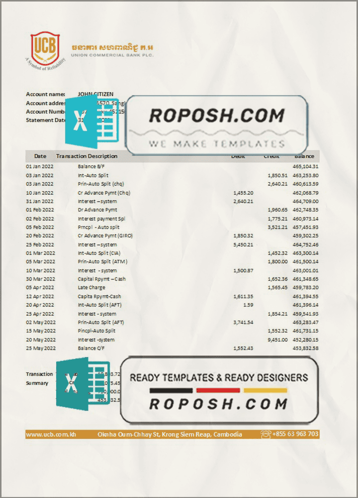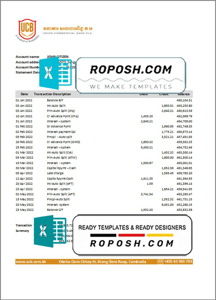 Get your fully editable Cambodia Union Commercial Bank Statement Excel Template from our website Roposh and customize it with your own information to create a realistic bank statement. This is especially useful if your bank statement is expired, stolen, or unavailable. We also offer editable credit card templates, ID card templates, bank statement PSD templates, driver’s license PSD templates, and printable editable blank utility bill templates.