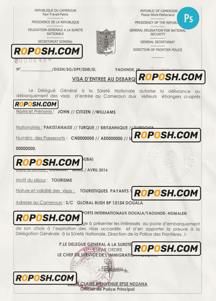 CAMEROON e-Visa template psd. Buy Customizable Travel Visa Template with high quality and enjoy its unique features such as easy to customize, Layer based, fonts included sample. you can edit this template and put any name, address, license number, Id number, birth date, height, weight, expire date, change photos etc. This Photoshop template is a layer based psd file and it’s easy to Editing.To modify this photoshop template file you will need a Photo editing software such as Adobe Photoshop No need to be expert on editing software like adobe Photoshop. However, You just have to basic knowledge on adobe photoshop, to edit this template. Never used low quality template. Your account may be suspended. Also, if you’re looking for an editable SSN template, Roposh is by your side so you can get it easily and even for free.