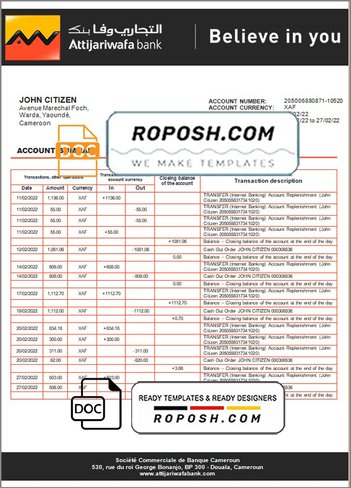Cameroon SCB bank statement Word and Pdf Template use for :