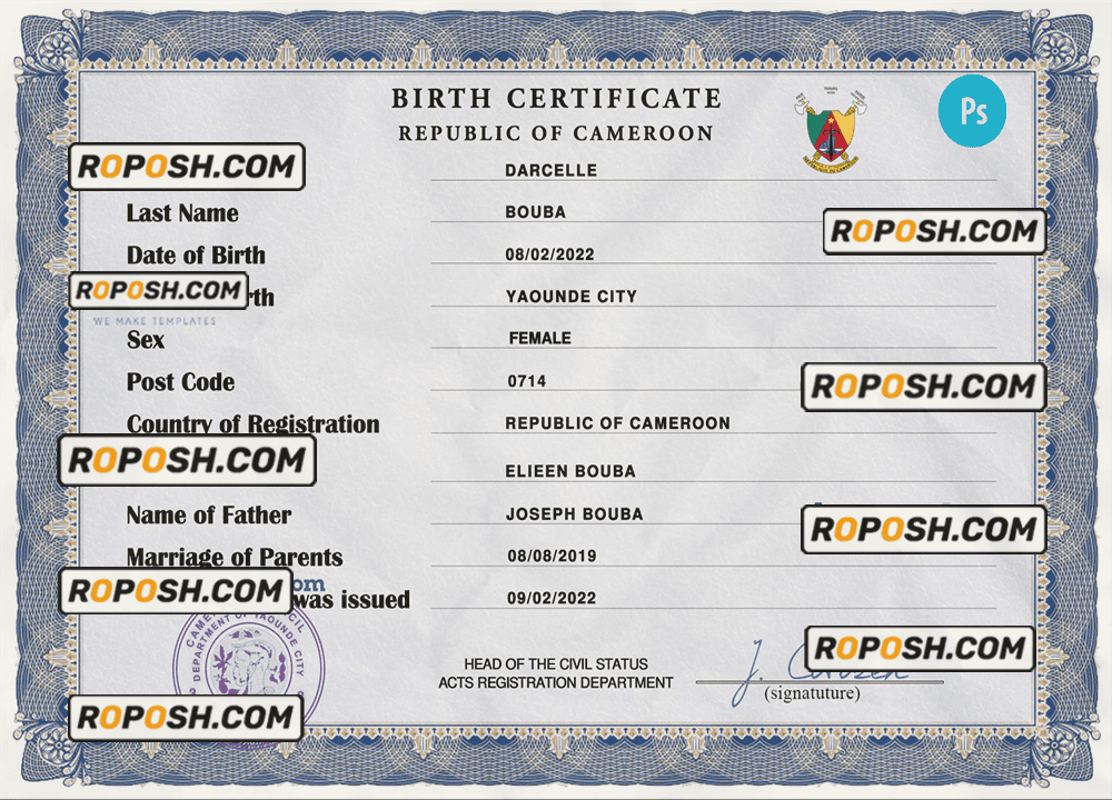 roposh offers hundreds of high-quality, realistic, and customizable birth certificates. The Cameroon birth certificate template is fully fillable, and you can complete it with any information you wish, such as name, surname, birth date, place of birth and etc. Whether you are using our PSD template (a layer-based adobe photoshop file) or our PDF template (a Microsoft Office editable file) you will get a package with fonts included instantly. No need to worry even if you can’t generate realistic birth proof yourself, we offer reliable editing service with your desired information for an extra charge. Also, we are always online and here to help you experience a confident purchase. So, reach out!