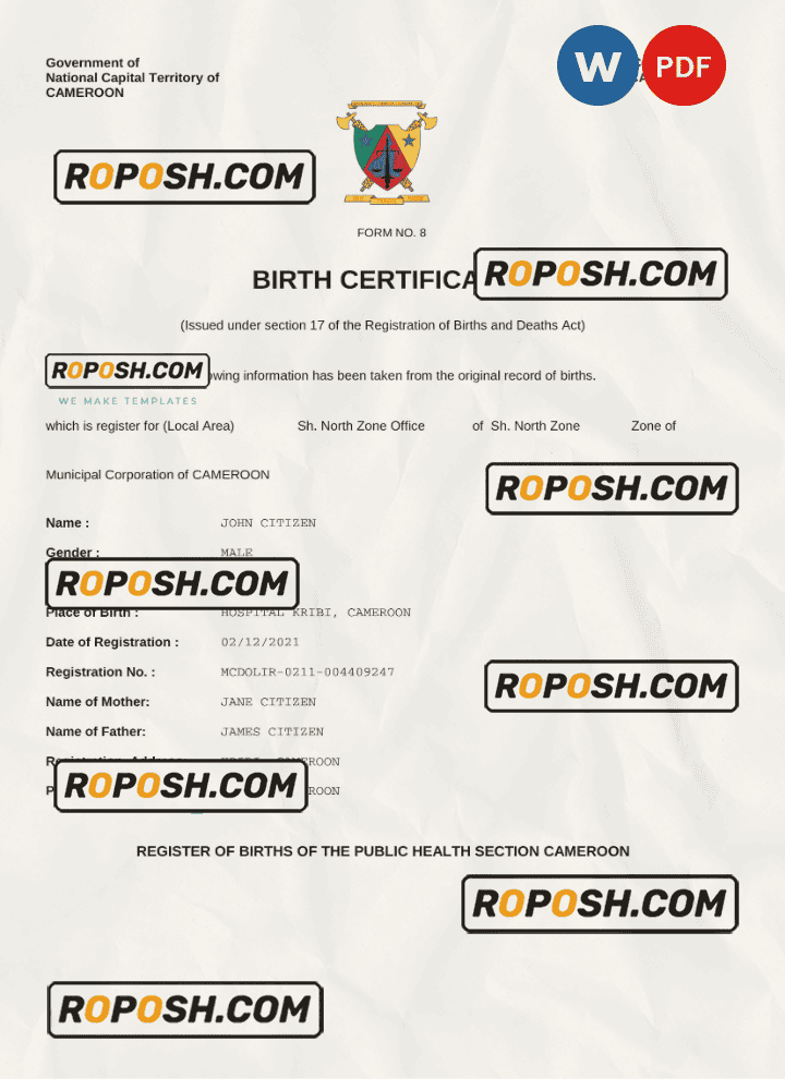 roposh offers hundreds of high-quality, realistic, and customizable birth certificates. The Cameroon birth certificate template is fully fillable, and you can complete it with any information you wish, such as name, surname, birth date, place of birth and etc. Whether you are using our PSD template (a layer-based adobe photoshop file) or our PDF template (a Microsoft Office editable file) you will get a package with fonts included instantly. No need to worry even if you can’t generate realistic birth proof yourself, we offer reliable editing service with your desired information for an extra charge. Also, we are always online and here to help you experience a confident purchase. So, reach out!