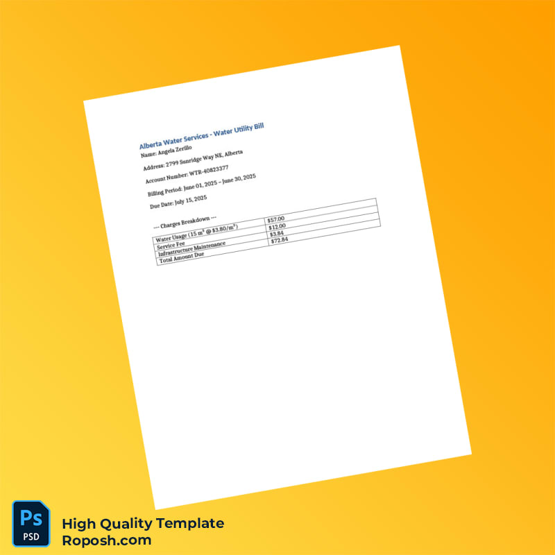 The Canada Alberta Water Services Editable Water Utility Bill Template is your reliable solution for creating professional-looking utility bills in both Word and PDF formats. Whether you’re needing proof of address for a rental application or to settle disputes, our customizable, user-friendly template is tailored for your convenience.