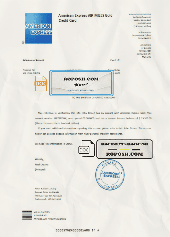 Canada American Express Air Miles bank account reference letter template in Word and PDF format