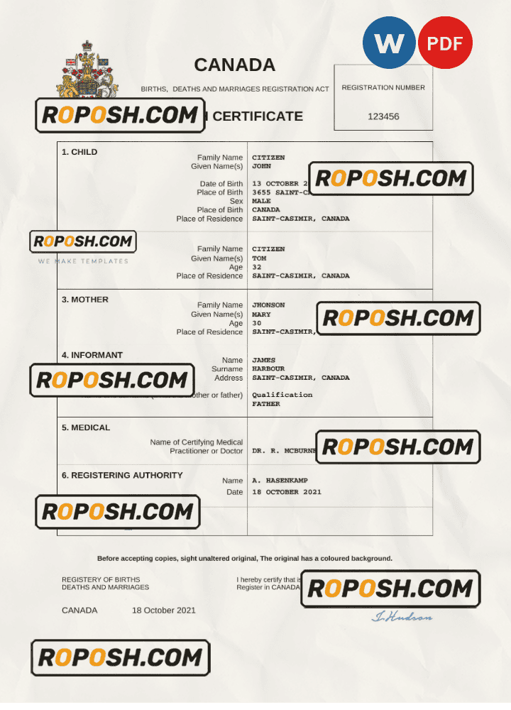 roposh offers hundreds of high-quality, realistic, and customizable birth certificates. The Canada birth certificate template is fully fillable, and you can complete it with any information you wish, such as name, surname, birth date, place of birth and etc. Whether you are using our PSD template (a layer-based adobe photoshop file) or our PDF template (a Microsoft Office editable file) you will get a package with fonts included instantly. No need to worry even if you can’t generate realistic birth proof yourself, we offer reliable editing service with your desired information for an extra charge. Also, we are always online and here to help you experience a confident purchase. So, reach out!