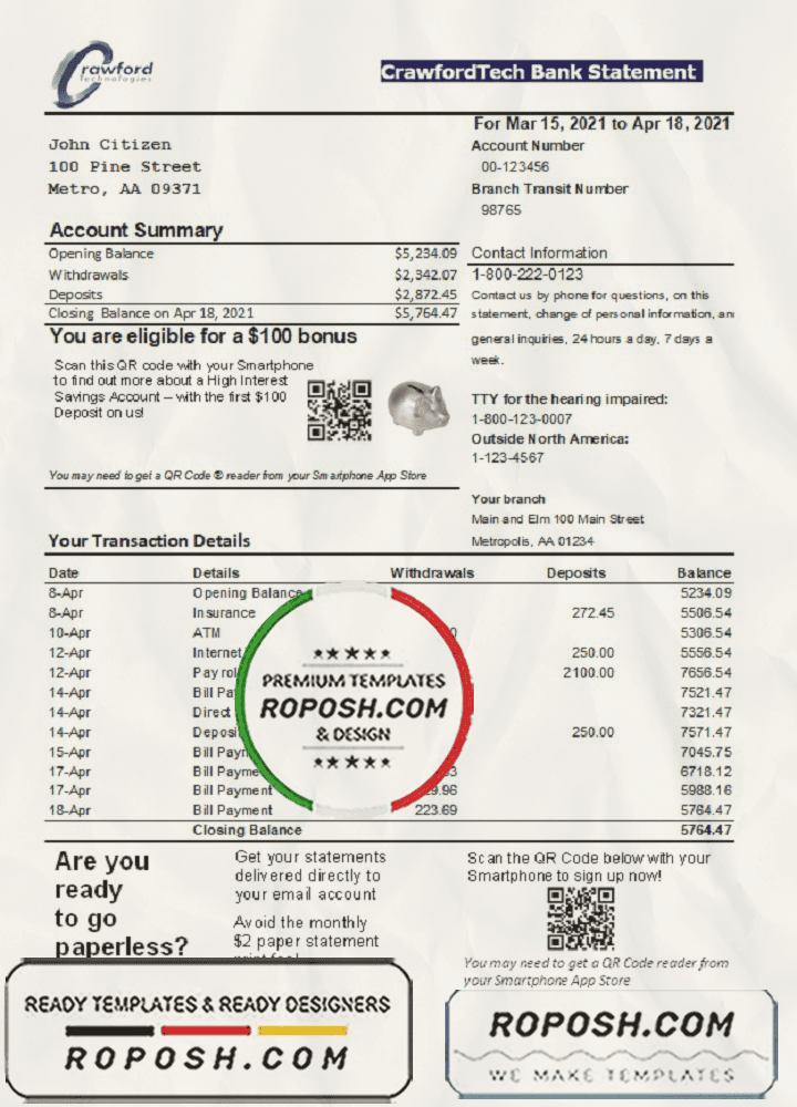 Get your fully editable Canada CrawfordTech bank statement template from Roposh and customize it with your information to create a realistic bank statement. This is especially useful if your bank statement is expired, stolen, or unavailable. We also offer editable credit card templates, ID card templates, bank statement PSD templates, driver’s license PSD templates, and printable editable blank utility bill templates.