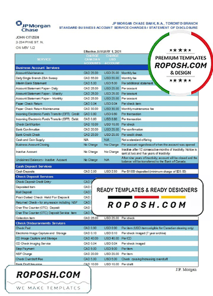 Canada JP Morgan Chase proof of address bank statement template in Excel an PDF format
