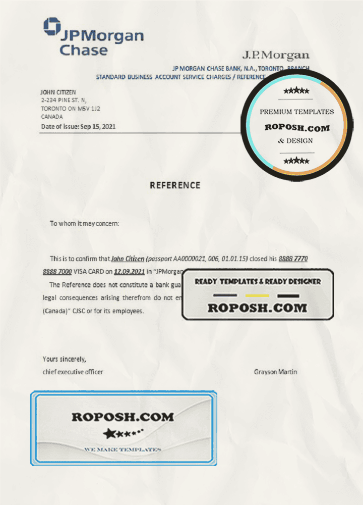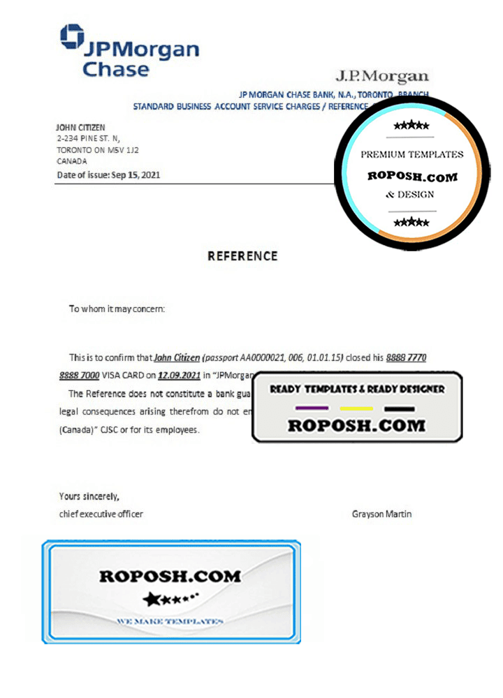 Canada JPMorgan Chase bank account closure reference letter template in Word and PDF format