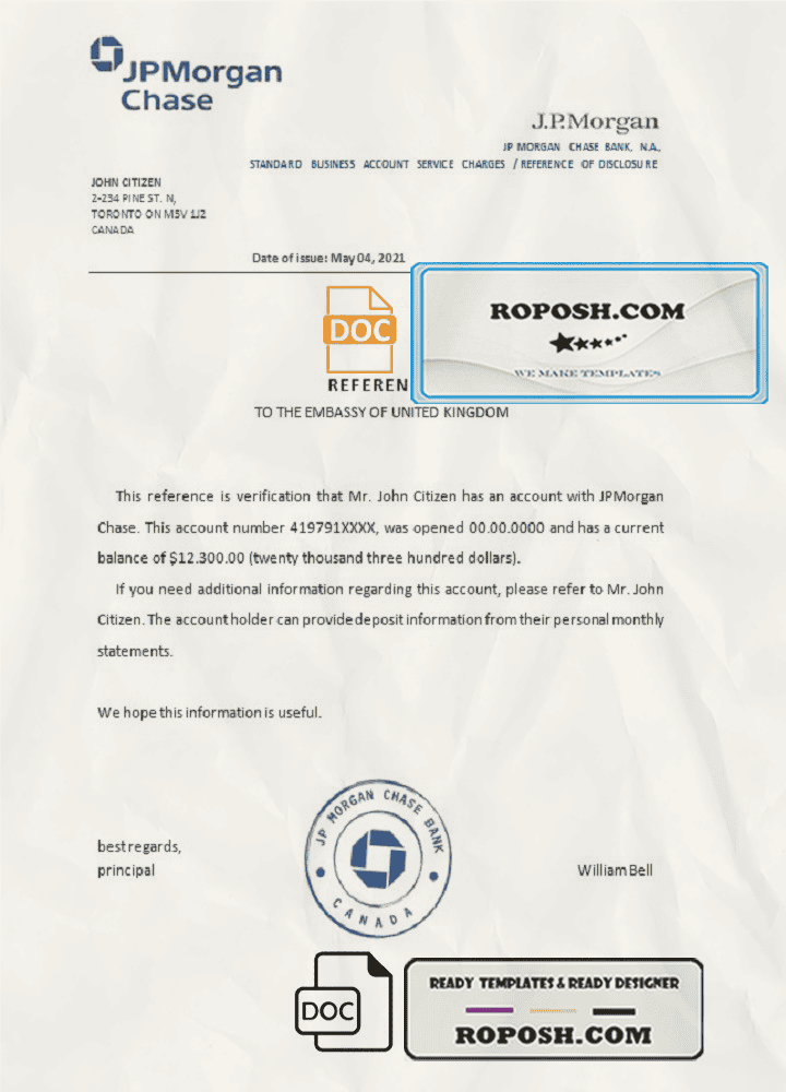 Canada JPMorgan Chase bank account reference letter template in Word and PDF format