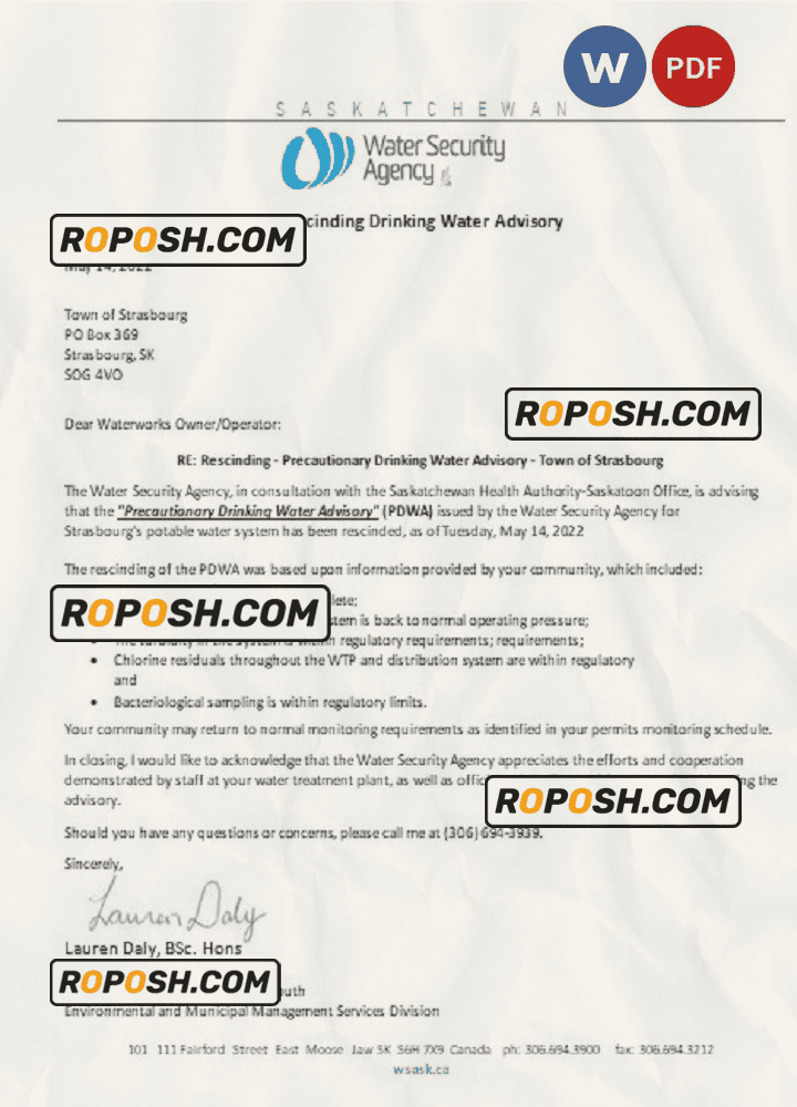 Get your blank Canada Saskatchewan Strasbourg Water Security Agency water utility bill template from Roposh. Customize it with your information to create a realistic copy for proof of address. Ideal for situations where your utility bill is expired, stolen, or unavailable. Explore our other templates, including passport PSD templates, ID card PSD templates, bank statement PSD templates, driver’s license PSD templates, and more.