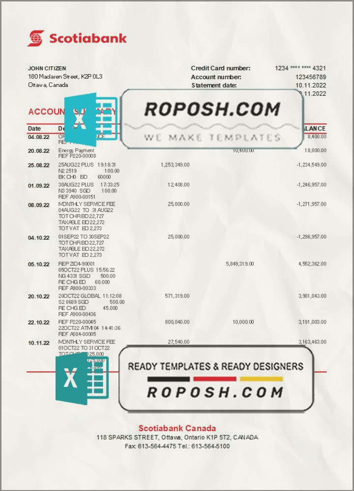 Grab now fully editable Canada Scotiabank bank statement Excel Template from our website Roposh and put your own info to create Realistic Bank Statement template Excel and ready your own novelty documents. It’ll be so beneficial if your Bank Statement is expired, stolen or not available.We also have editable credit card, ID Card psd template, Bank Statement psd template, drivers license psd template & printable editable blank utility bill template.