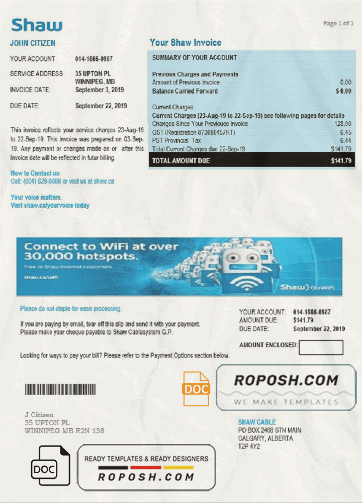 Download our high-quality, fully editable Canada Shaw utility bill Word template. This customizable template is layer-based and includes all necessary fonts. Easily modify the template to include any name, address, license number, ID number, birth date, height, weight, expiration date, and more. Perfect for creating a editable utility bill for proof of address. Ensure your documents are up-to-date and professional with our easy-to-edit template. Note: Use Microsoft Word or any compatible Word editing software to modify this template.