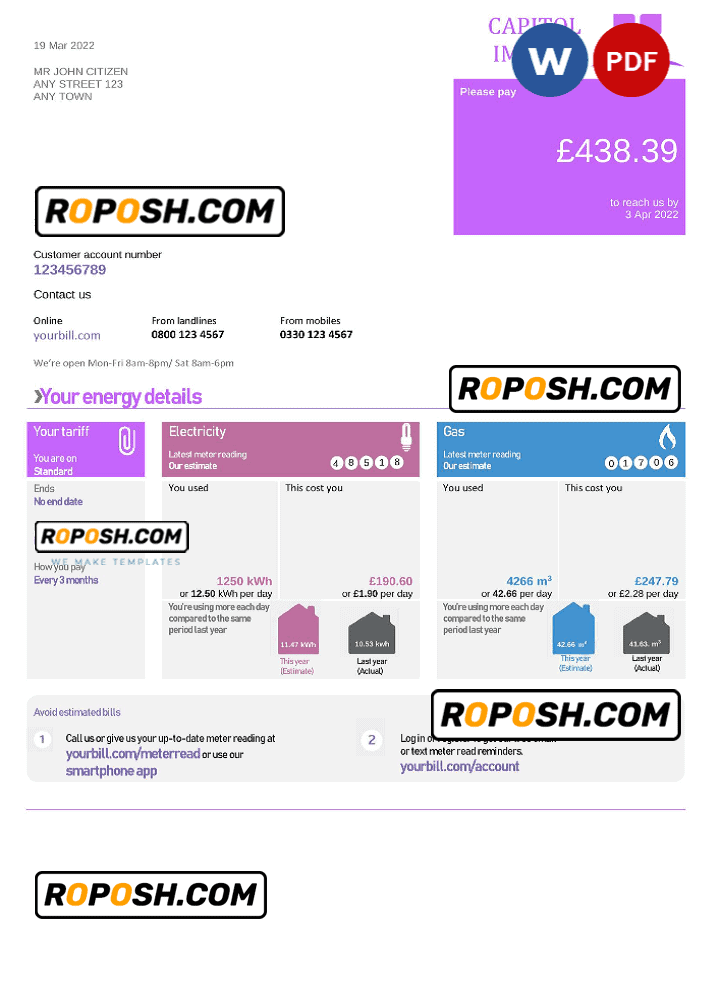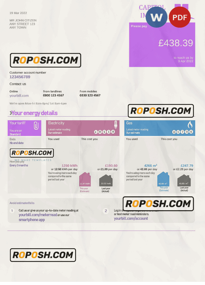 Get your blank Capitol Impact Universal Multipurpose Utility Bill Template from Roposh today. Customize it with your information to create a editable utility bill for proof of address. Ideal for situations where your utility bill is expired, stolen, or unavailable. We also offer a variety of other templates, including passport PSD templates, ID card PSD templates, bank statement PSD templates, driver’s license PSD templates, and utility bill PSD templates.