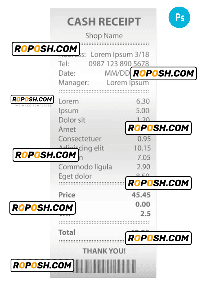 • Versatile: Our shop receipt PSD Template is suitable for a variety of verifications, and to prove your purchase.
