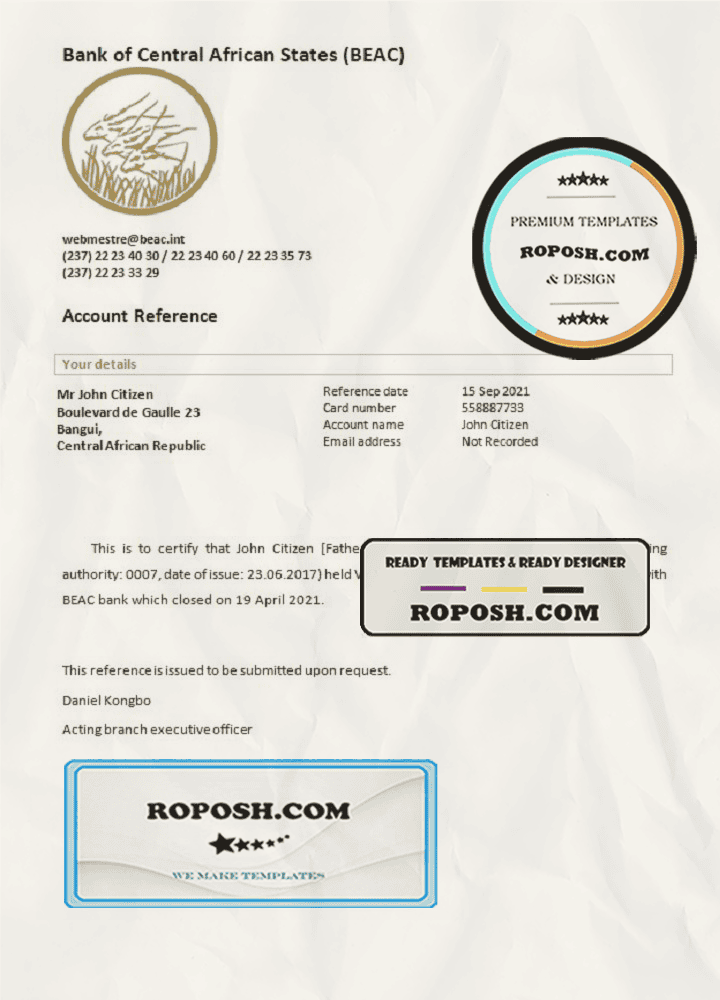 Central African Republic Bank of Central African States (BEAC) bank account closure reference letter template in Word and PDF format