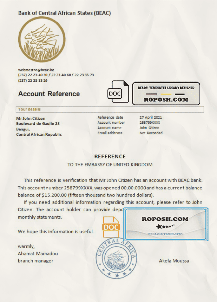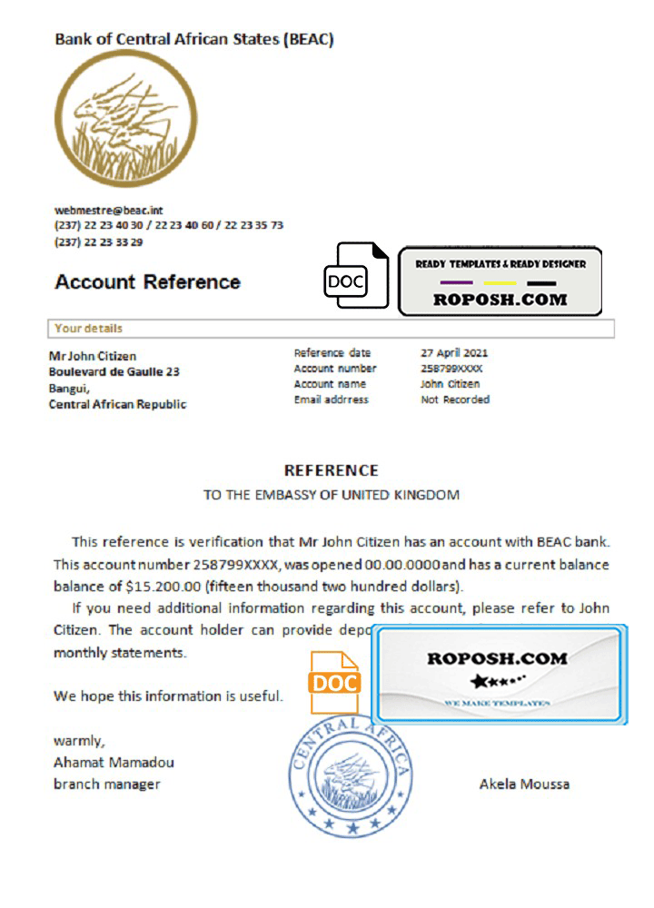 Central African Republic Bank of Central African States (BEAC) bank account reference letter template in Word and PDF format