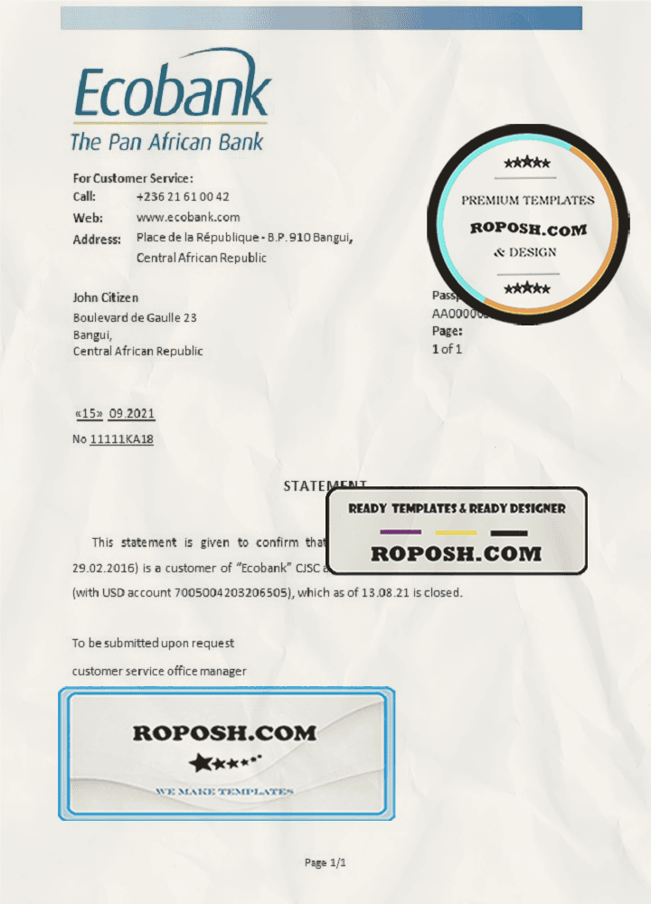 Central African Republic Ecobank bank account closure reference letter template in Word and PDF format offer high-quality customizable bank reference form template in PSD and Word format, allowing you to easily fill in your personal details and make them look authentic. Our templates are perfect for online account verification, research, presentation, or work.