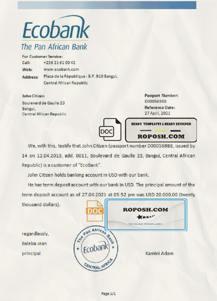 Central African Republic Ecobank bank account reference letter template in Word and PDF format