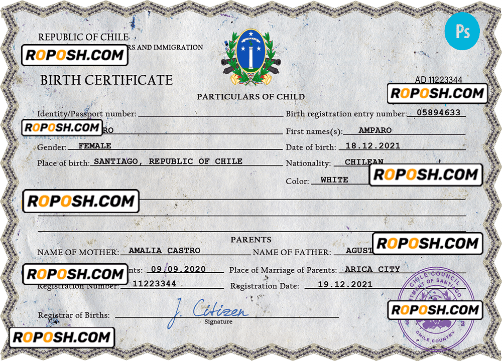 roposh offers hundreds of high-quality, realistic, and customizable birth certificates. The Chile birth certificate template is fully fillable, and you can complete it with any information you wish, such as name, surname, birth date, place of birth and etc. Whether you are using our PSD template (a layer-based adobe photoshop file) or our PDF template (a Microsoft Office editable file) you will get a package with fonts included instantly. No need to worry even if you can’t generate realistic birth proof yourself, we offer reliable editing service with your desired information for an extra charge. Also, we are always online and here to help you experience a confident purchase. So, reach out!