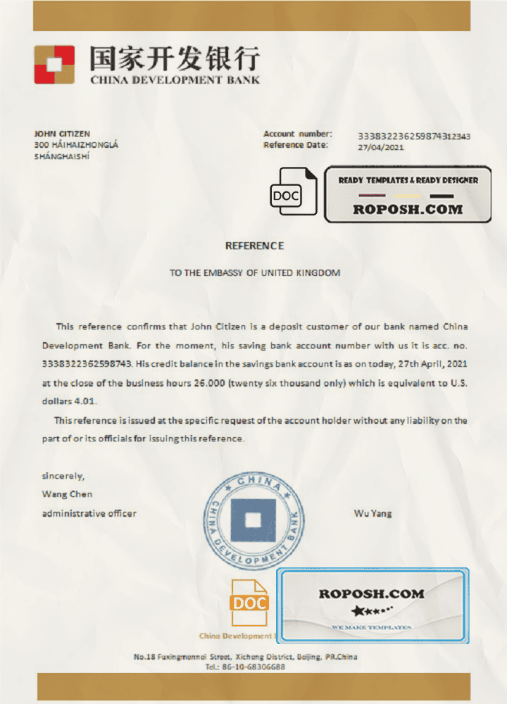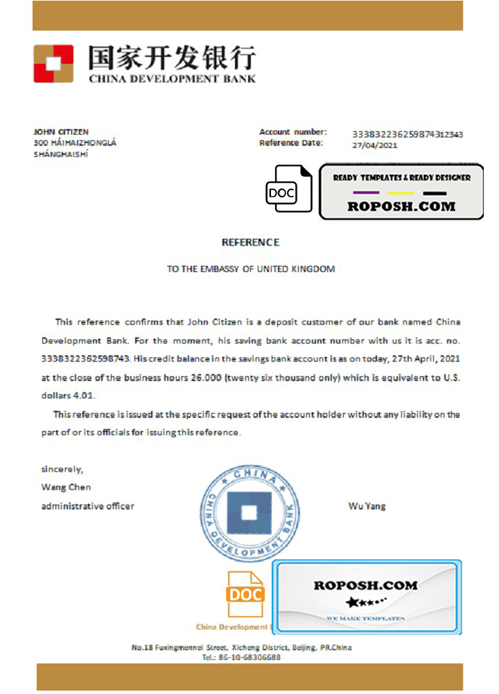 Be the first to review “China Development bank account reference letter template in Word and PDF format”