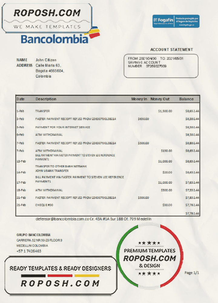 Get your fully editable Colombia Bancolombia Bank Statement Template from Roposh now. Customize it with your information to create a realistic bank statement. This is especially useful if your bank statement is expired, stolen, or unavailable. We also offer editable credit card templates, ID card templates, bank statement PSD templates, driver’s license PSD templates, and printable editable blank utility bill templates.