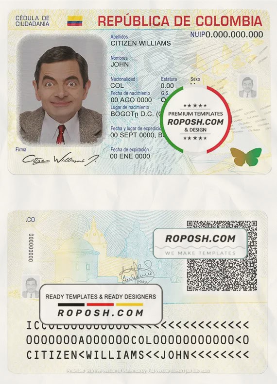 Get your fully editable Colombia ID Card PSD Template now from Roposh. Customize it with your own information to create a realistic Editable ID card. This template is especially useful if your ID card is expired, stolen, or unavailable. We also offer a variety of other templates, including passport PSD templates, editable travel visa templates, bank statement PSD templates, driver’s license PSD templates, and utility bill templates for proof of address.
