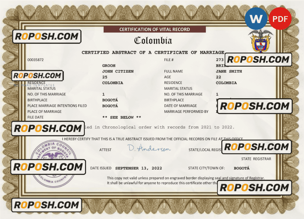 Colombia marriage certificate Word and PDF template, fully editable