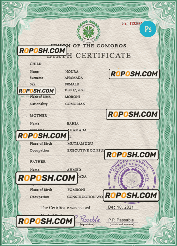 roposh offers hundreds of high-quality, realistic, and customizable birth certificates. The Comoros birth certificate template is fully fillable, and you can complete it with any information you wish, such as name, surname, birth date, place of birth and etc. Whether you are using our PSD template (a layer-based adobe photoshop file) or our PDF template (a Microsoft Office editable file) you will get a package with fonts included instantly. No need to worry even if you can’t generate realistic birth proof yourself, we offer reliable editing service with your desired information for an extra charge. Also, we are always online and here to help you experience a confident purchase. So, reach out!