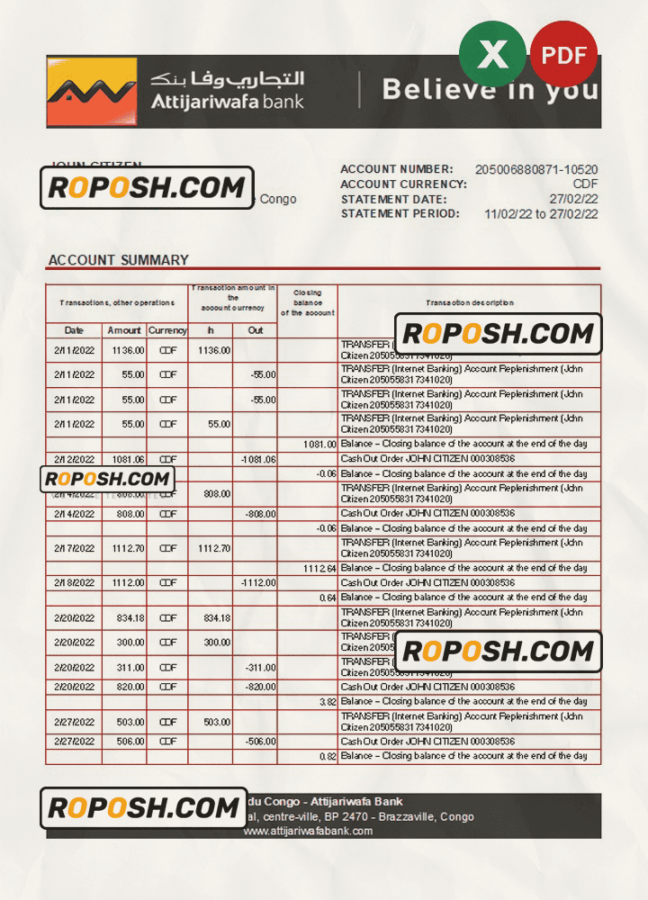 No need for Photoshop! Our high-quality template ensures your account remains secure and unsuspended. Download the fully editable Congo Credit du Congo bank statement Excel template from Roposh and create your own novelty documents. This template is beneficial if your bank statement is expired, stolen, or unavailable. We also offer editable credit card templates, ID card PSD templates, bank statement PSD templates, driver’s license PSD templates, and printable editable blank utility bill templates.