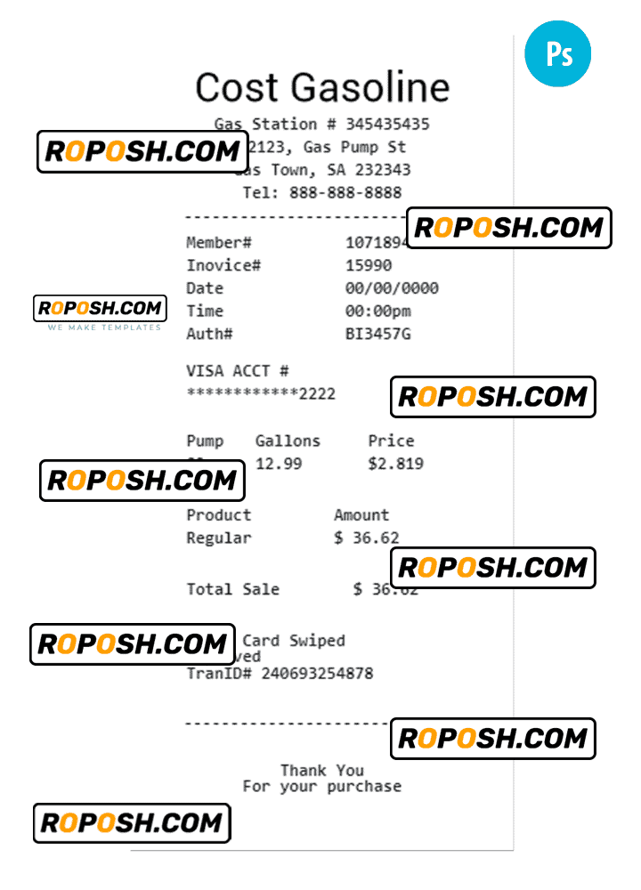 A COST GASOLINE payment receipt in psd format is a document that can prove a successful transaction. It includes the purchase details such as the date of the transaction, the amount paid, a description of goods or services purchased, and a unique receipt number.