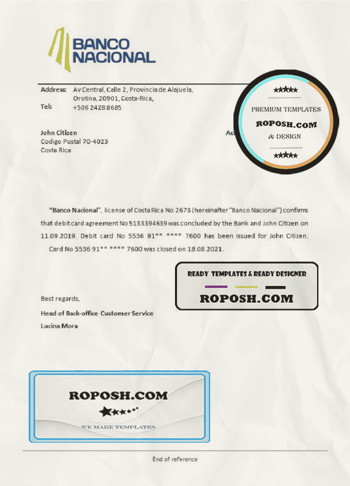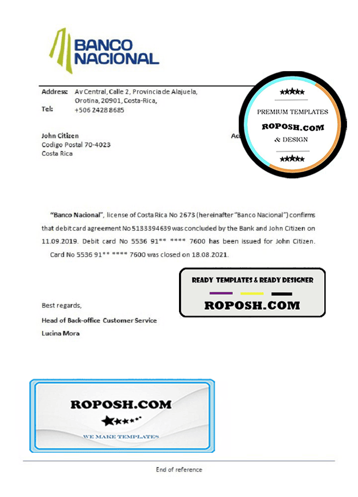 Costa Rica Banco Nacional de Costa Rica bank account closure reference letter template in Word and PDF format