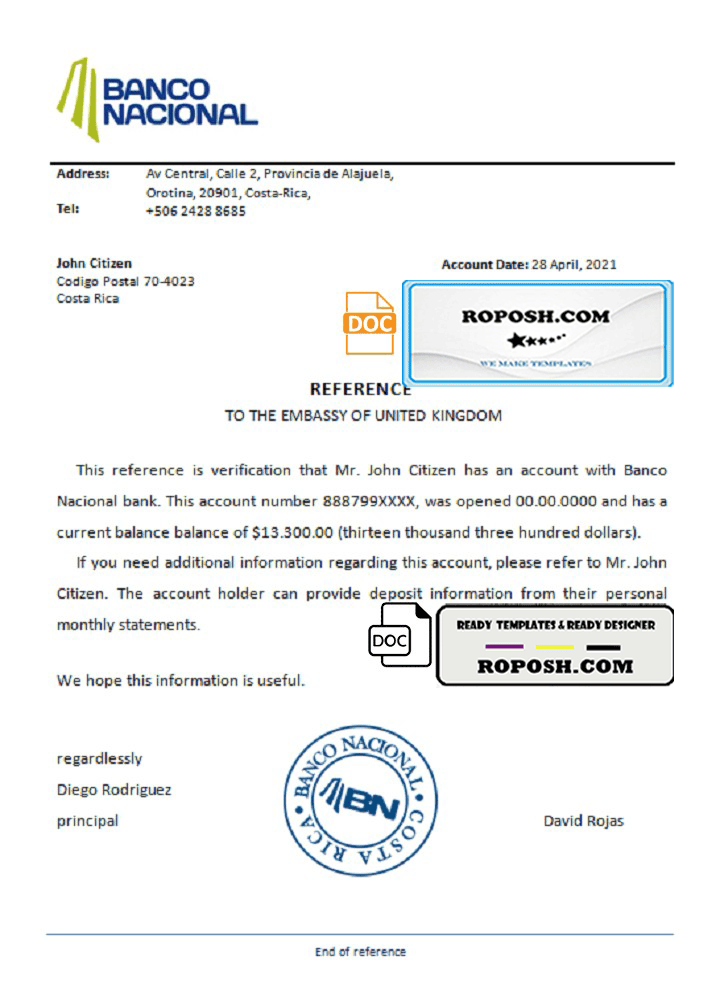 Costa Rica Banco Nacional de Costa Rica bank account reference letter template in Word and PDF format offer high-quality customizable bank reference form template in PSD and Word format, allowing you to easily fill in your personal details and make them look authentic. Our templates are perfect for online account verification, research, presentation, or work.