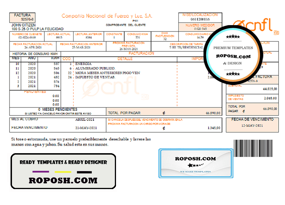 Get your blank Costa Rica Compañía Nacional de Fuerza y Luz, S.A. (CNFL) utility bill template from Roposh. Customize it with your information to create a editable utility bill for proof of address. Ideal for situations where your utility bill is expired, stolen, or unavailable. Explore our other templates, including passport PSD templates, ID card PSD templates, bank statement PSD templates, driver’s license PSD templates, and more.