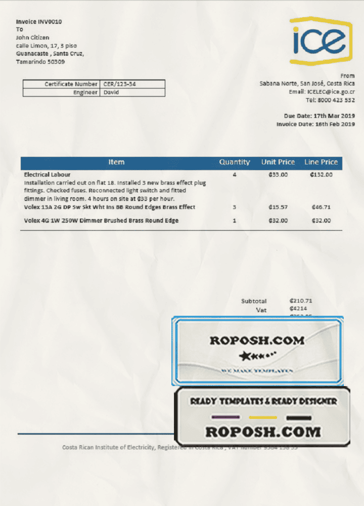 Costa Rica Costa Rican Institute of Electricity utility bill template in Word and PDF format