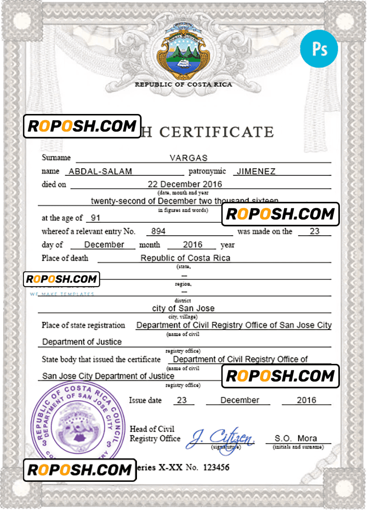 Be the first to review “Costa Rica death certificate PSD template, completely editable”