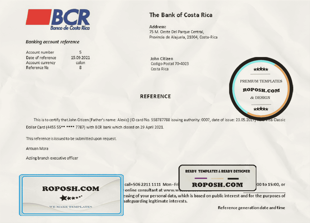 Costa Rica The Bank of Costa Rica bank account closure reference letter template in Word and PDF format