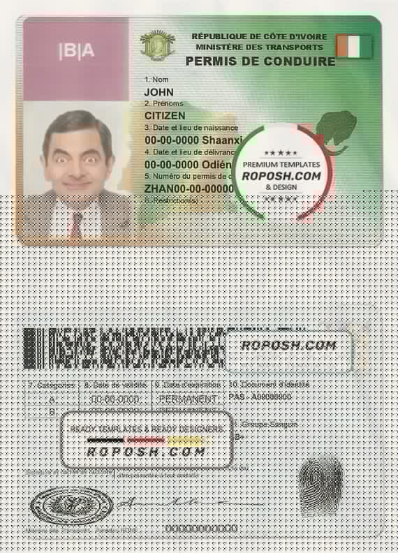 Get your hands on the Cote D’Ivoire Drivers License PSD Template from Roposh today. This editable template is ideal for creating a realistic Cote D’Ivoire driver license. Whether your ID is expired, stolen, or unavailable, this template is a valuable resource. We also offer a variety of other templates, including passport PSD templates, blank ID card templates, bank statement PSD templates, drivers license PSD templates, and travel visa psd template.