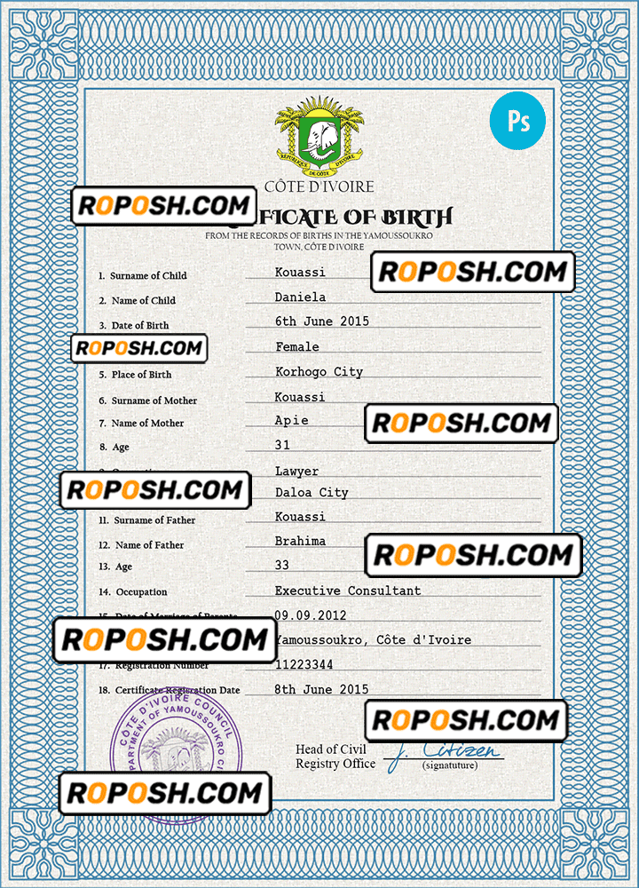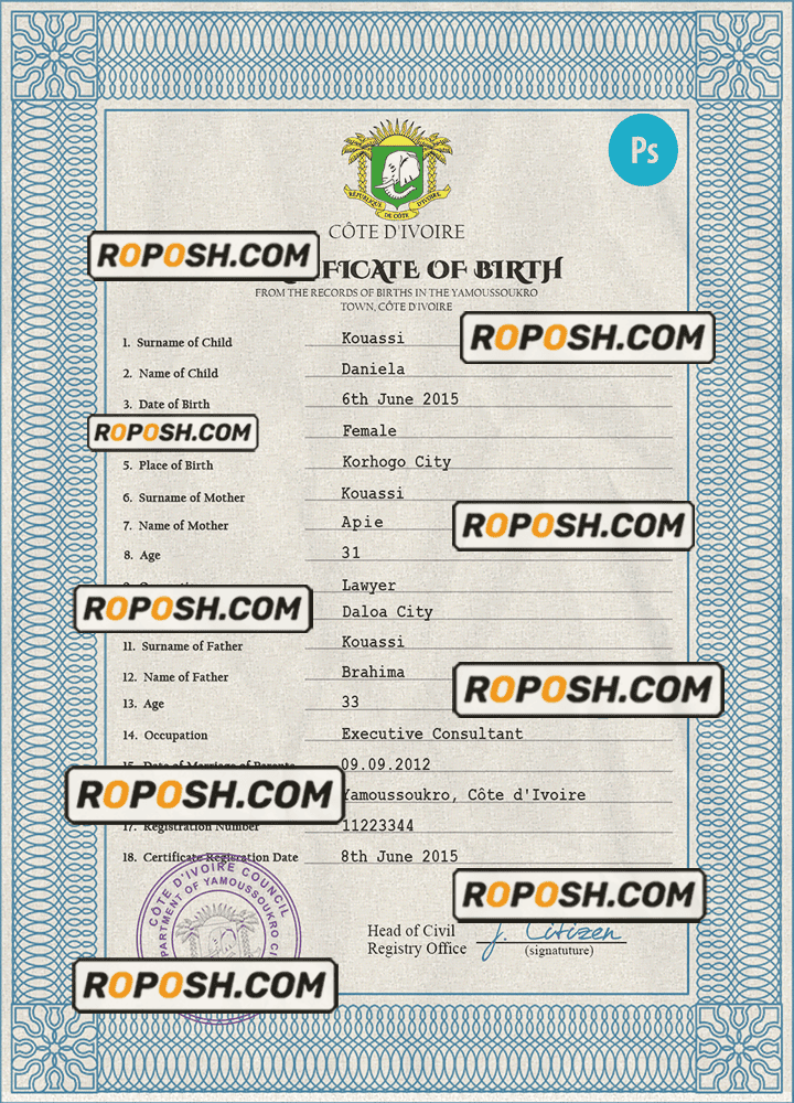 roposh offers hundreds of high-quality, realistic, and customizable birth certificates. The Côte d’Ivoire birth certificate template is fully fillable, and you can complete it with any information you wish, such as name, surname, birth date, place of birth and etc. Whether you are using our PSD template (a layer-based adobe photoshop file) or our PDF template (a Microsoft Office editable file) you will get a package with fonts included instantly. No need to worry even if you can’t generate realistic birth proof yourself, we offer reliable editing service with your desired information for an extra charge. Also, we are always online and here to help you experience a confident purchase. So, reach out!