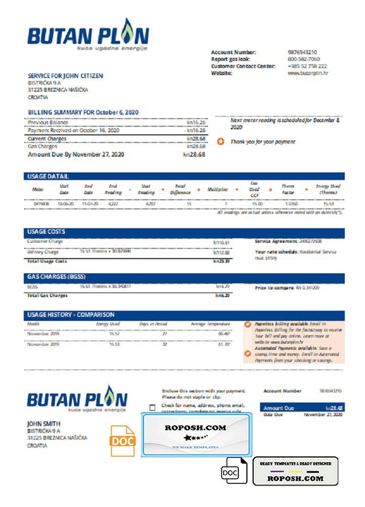 Download our fully editable Croatia BUTAN PLIN d.o.o. gas utility bill Word template. This high-quality, customizable template is layer-based and includes all necessary fonts. Easily modify the template to include any name, address, license number, ID number, birth date, height, weight, expiration date, and more. Perfect for creating a editable utility bill for proof of address. Ensure your documents are up-to-date and avoid account suspensions. Requires Microsoft Word for editing.