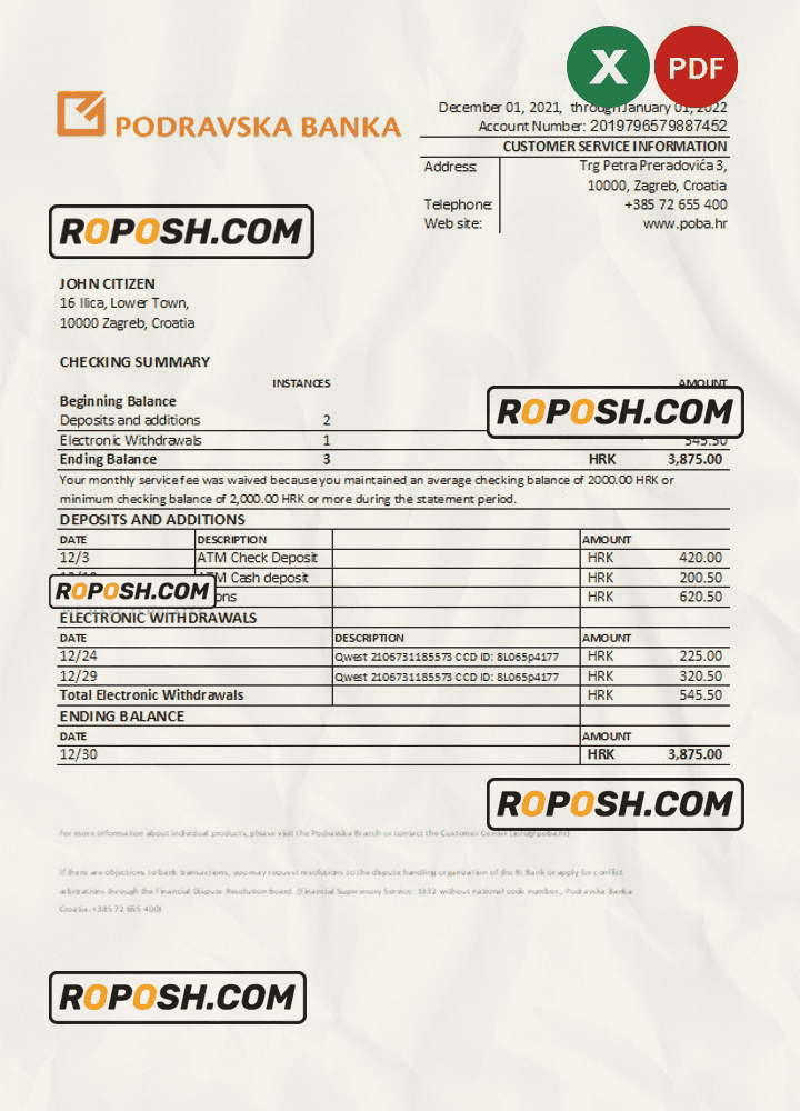 Croatia Podravska bank statement Template in Excel an PDF format use for :