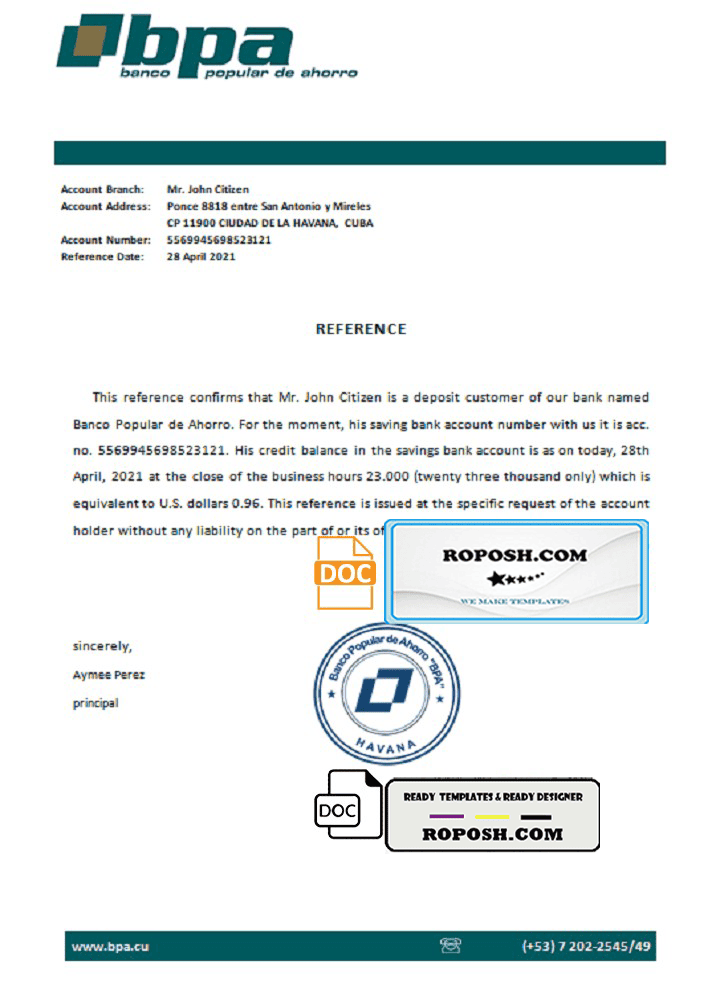 Cuba Banco Popular de Ahorro (BPA) bank account reference letter template in Word and PDF format